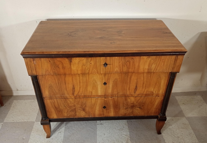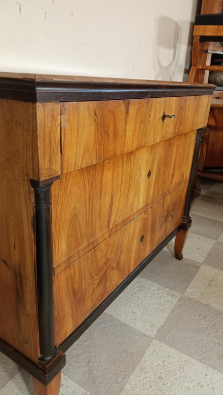 Klassische frühe Biedermeier Kommode süddeutsch um 1810, mit ebonisierten Halbsäulen, vorgesetzte obere Schublade auf eleganten Spitzbeinen, selten findet man Möbelstücke aus dieser Zeit die sich noch im originalem, hervorragenden Zustand befinden, die Schubladen laufen einwandfrei. Die Kommode hat eine wundervolle Patina und ein schönes Furnierbild, farblich ist sie auch mit Kirschbaum kombinierbar. Die Kommode stand um die 200 Jahre in der "guten Stube" in einem Haus in der fränkischen Schweiz und wurde selten benutzt, sie hat