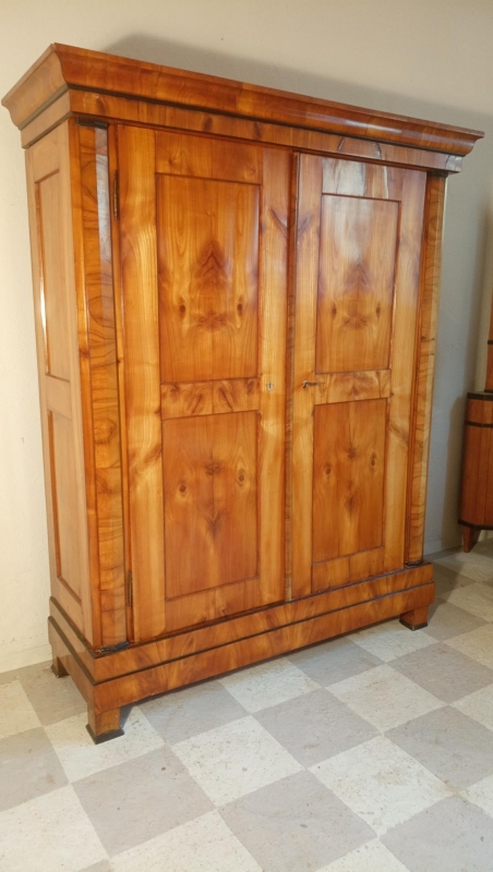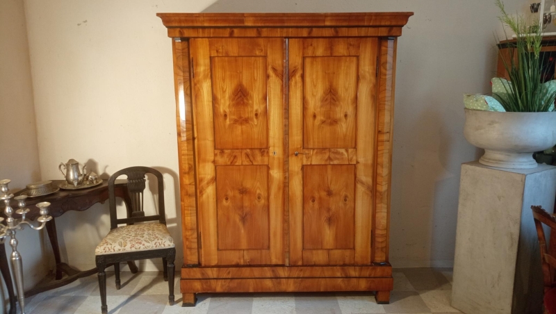 Einzigartiger Biedermeierschrank Kirschbaum auf Nadelholz furniert von ca. 1820, der Schrank ist 8 fach kassettiert und hat ein traumhaftes Furnierbild, er steht auf s.g. Stempelfüssen, die schwarzen Applikationen bilden einen schöne Kontrast zu dem Kirschbaum. Der Schrank hat die ein oder andere übliche Gebrauchsspur, er befindet sich in einem guten, wohnfertigem alt-restaurierten Zustand im Zuge dessen wurde der Schrank mit einer hellen Tapete ausgekleidet, er hat eine sehr gut erhaltene Schellackoberfläche, der Schrank hat seitlich konisch zulaufende Säulen, er ist für den Transport zerlegbar und leicht aufzubauen, Aufbau kann vor Ort erfolgen, hierzu bitte vorher Kontakt aufnehmen,