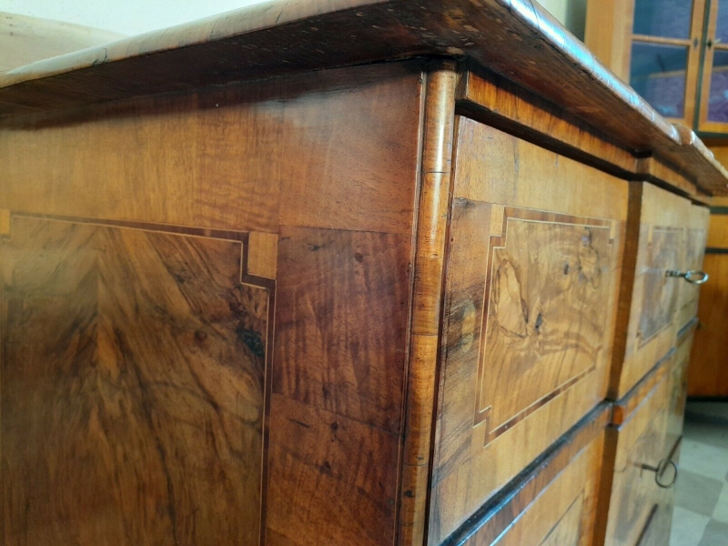 Klassizistische / Louis Seize Kommode von ca. 1780, vermutlich aus Süddeutschland. Die Front der Kommode ist dreifach gegliedert mit Bandeinlagen aus Zwetschge und Ahorn und Nusswurzelfeldern. Die Kommode wurde behutsam in Patina restauriert, d.h. die Patina wurde im Rahmen der Schellackhandpolitur konserviert und somit wurde der antike Charakter erhalten. Die Schubladen sind alle sehr leichtgängig da im Rahmen der Restaurierung auch die Laufleisten überarbeitet wurden. Ein sehr kunstvolles, wertbeständiges Möbelstück das auch einer modernen Umgebung gut zur Geltung kommt.