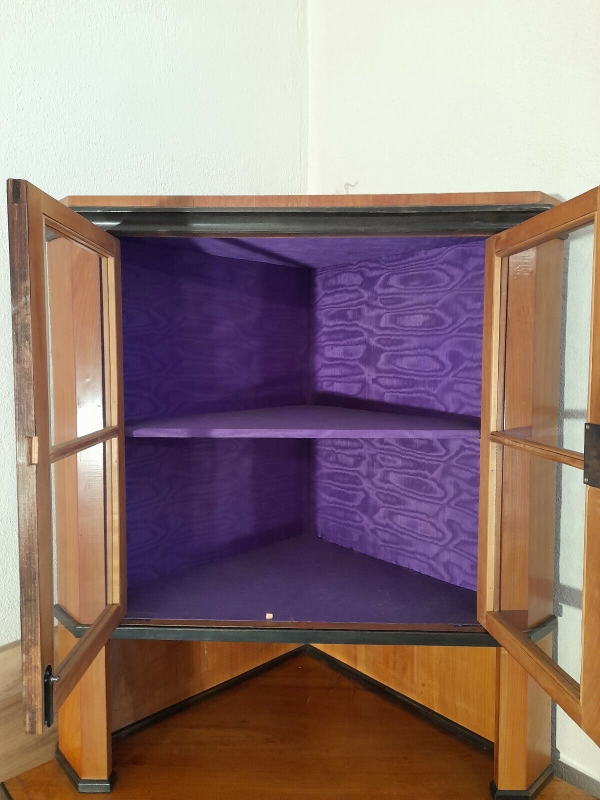 Der Eckschrank befindet sich in gutem, altrestaurierten Zustand. Es sind die originalen Scheiben erhalten geblieben, hinter denen reichlich Raum für schöne Sammlerstücke, Gläser oder das gute Porzellan ist. Der Aufsatz steht auf einem klassischen Unterschrank mit 2 Türen, die Wangen sind abgeschrägt. Darüber befindet sich eine geräumige Schublade für Besteck, Servietten oder Ähnliches.